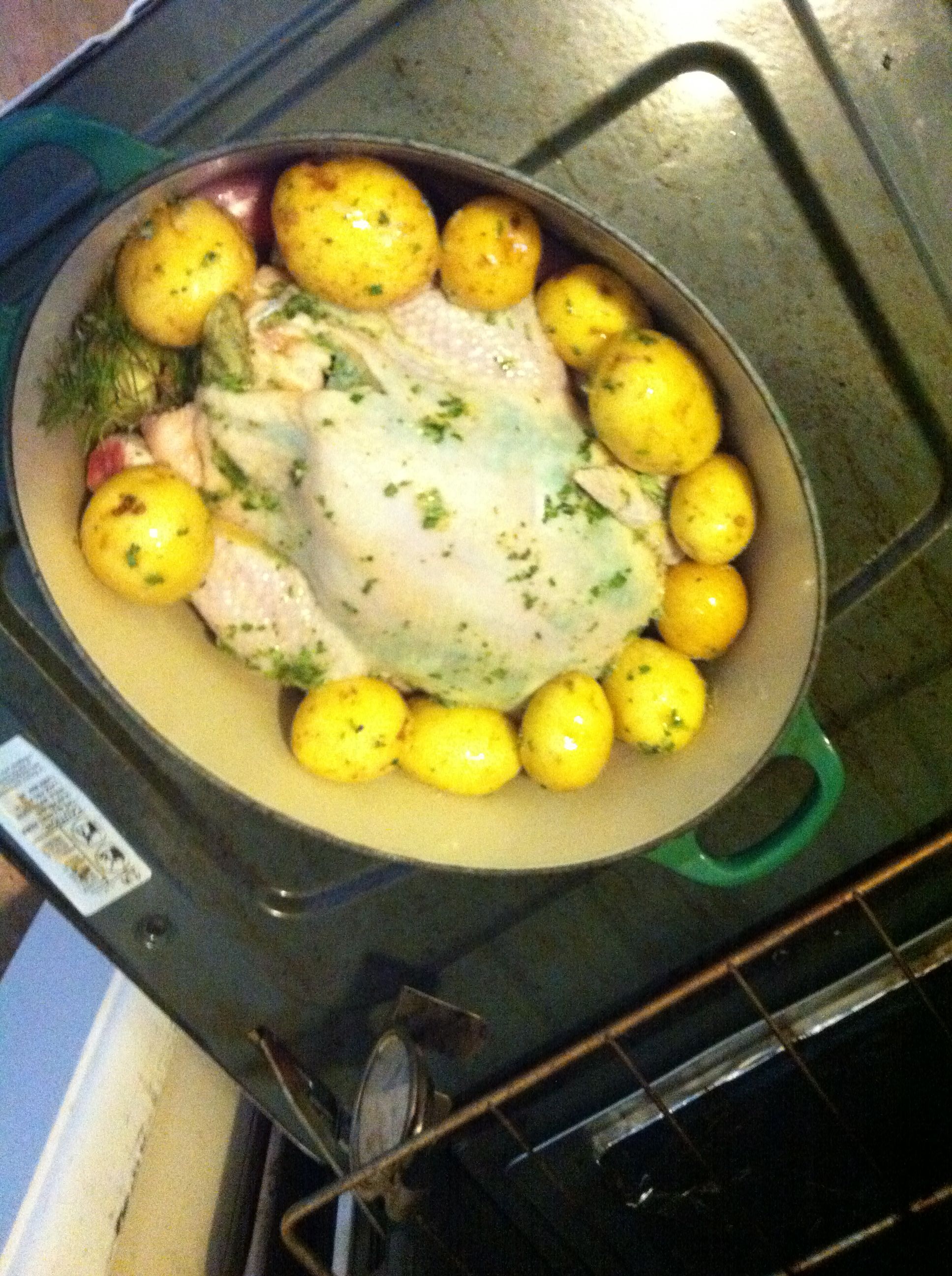 But I digress. This was the first chicken I’d bought from the farmer’s market in a while, so I did it up with a ton of herbs and butter. I didn’t roast the potatoes as I probably should have done, but I couldn’t be bothered to go and get the roasting tin from out back so I just popped them in the oval Le Creuset Dutch oven around the chicken. I cobbled together a few recipes—the chicken is a bit of what I could remember from Jamie Oliver and part from a Sunset magazine recipe to add some gravy. Nothing goes better with potatoes than gravy. Except butter. Butter goes well too…