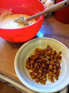 Peel and core the apple; cut into quarters and chop into 1/2 inch chunks. You don’t have to be too precise. Melt the 2 Tbs of butter in a frying pan over medium heat and add the apples. Keep stirring and tossing them occasionally in the butter until they go all brown on the sides, about 15 minutes. Stir in the cinnamon. Let cool.