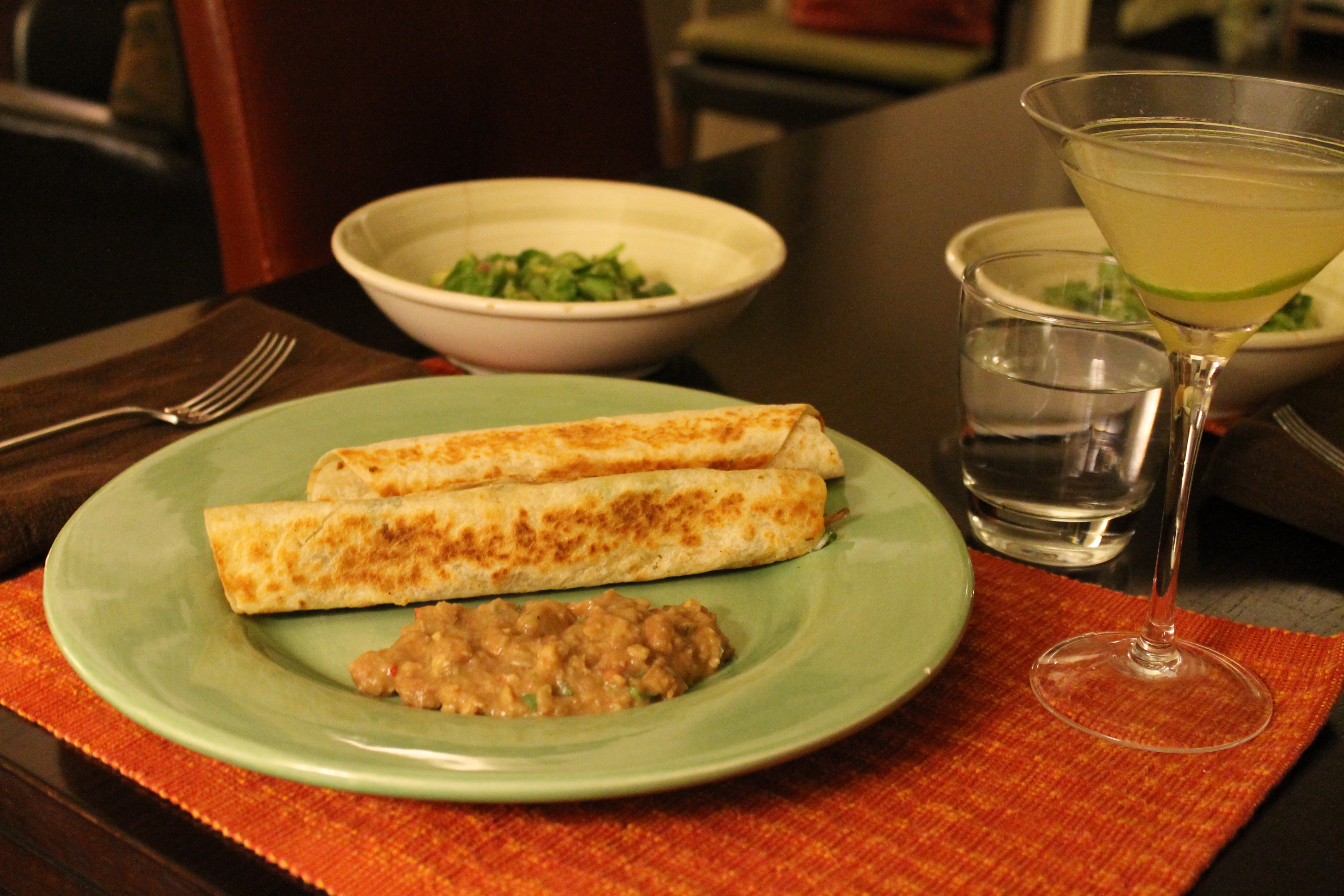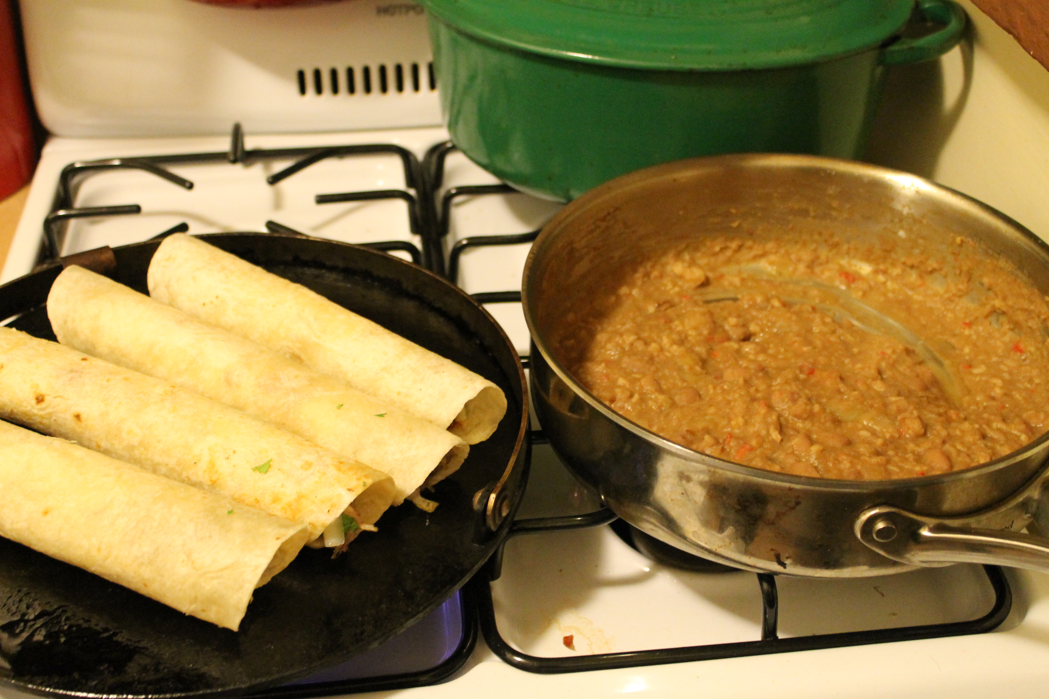 Here’s the recipe for the carnitas taquitos and the quick refried beans: