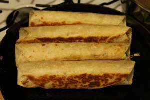 Heat the pan over medium heat and add just a little bit of oil so they don’t stick. Carefully add the taquitos to the pan, seam side down. Check after a few minutes to see if the tortilla is getting brown, then roll the taquitos over a bit until they’re sitting on uncooked tortilla. Keep an eye on them so they don’t burn, and turn them carefully so that the filling doesn’t spill out.