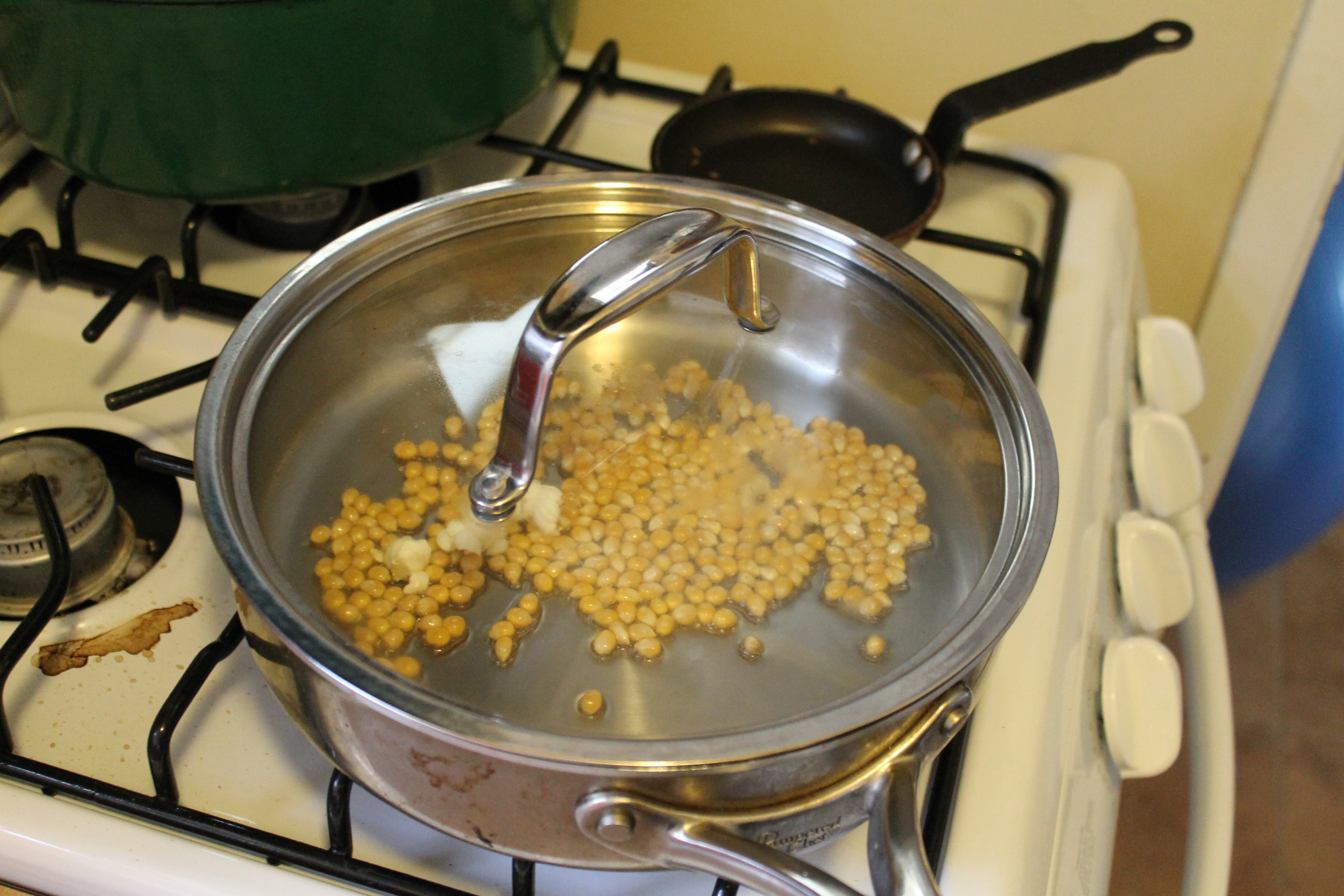 Once all three kernels have popped, you’re ready to go with the rest. Open your frying pan’s lid and throw in the rest of the popcorn kernels; cover again quickly. Give the frying pan a shake, holding on to the lid if necessary. Nobody wants hot, flying corn kernels in the kitchen, trust me.