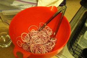 Then you can get started on the rest of the recipe, but don’t put the mandoline away yet. You’ll need it to slice the red onion on its thinnest setting, then put them in a non-metal bowl and add the lime juice. Stir and leave to marinate. These really make the dish, so don’t skip them! The lime juice totally mellows out the onion flavor, in case you’re worried that the onions will be sharp.