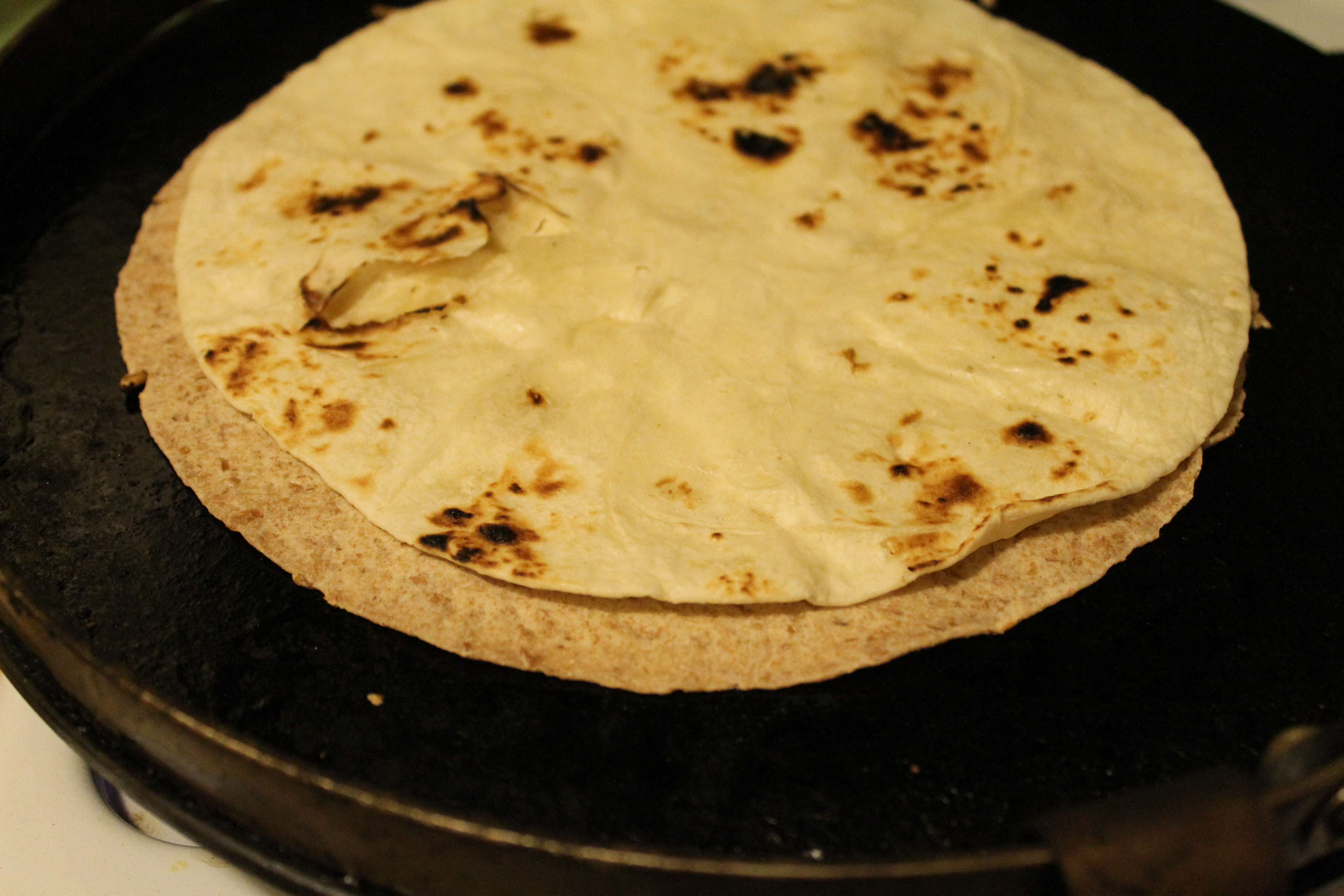 I use my crumpet pan (which I’ve spoken of earlier) to toast tortillas, as it works exceedingly well. I learned a trick on heating tortillas from one of our friends who doesn’t even like Mexican food—put two on top of each other, and when you flip them, flip the top tortilla. This way you get to heat two tortillas at the same time, which is great when you have at least two for dinner. By the way, I used sprouted wheat tortillas while The Husband had plain flour tortillas. They make me feel a little healthier.