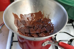 Start by heating your chocolate in a double boiler. Chop or break up the chocolate, put it into a bowl on top of a simmering pan of water. MAKE SURE the bowl does not touch the water, or your chocolate will go all funny. Once it’s melted, set it aside, but don’t throw out the water, as you’ll need it in a minute.