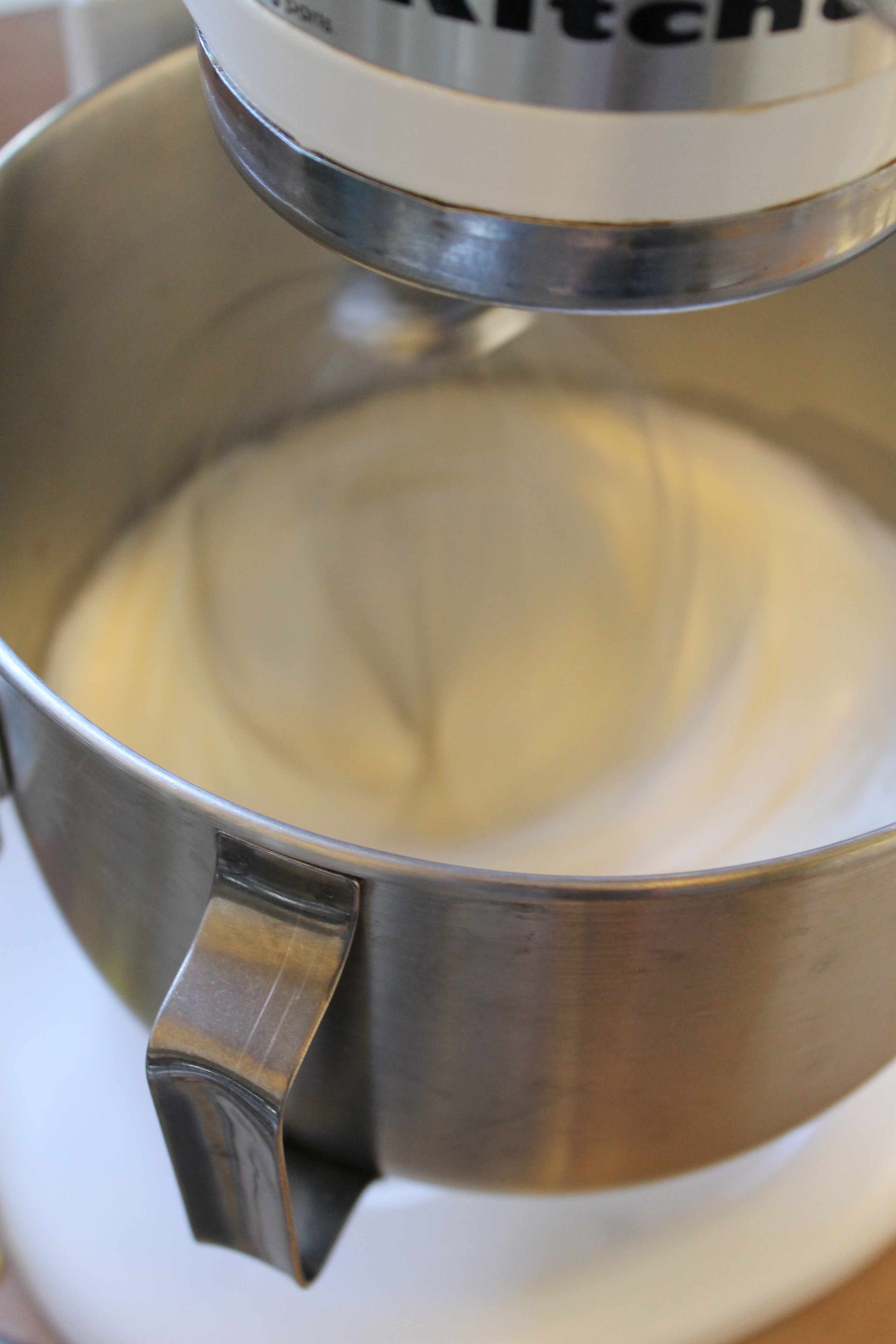 This you really need a Kitchen Aid-style mixer for with a metal bowl. I guess you could heat it in another bowl and then put it into your mixer, but I’ve never done it like that. Let me know how it goes if you try it. Put the sugar and the egg whites into the metal mixing bowl and put it over a pan of simmering water. Whisk it together constantly while it’s over the heat. After about 2 minutes, pull up some of the mixture and rub it between your fingers. If it’s still grainy, keep going. Your aim is to melt the sugar into the egg whites; this is why you want the superfine sugar.