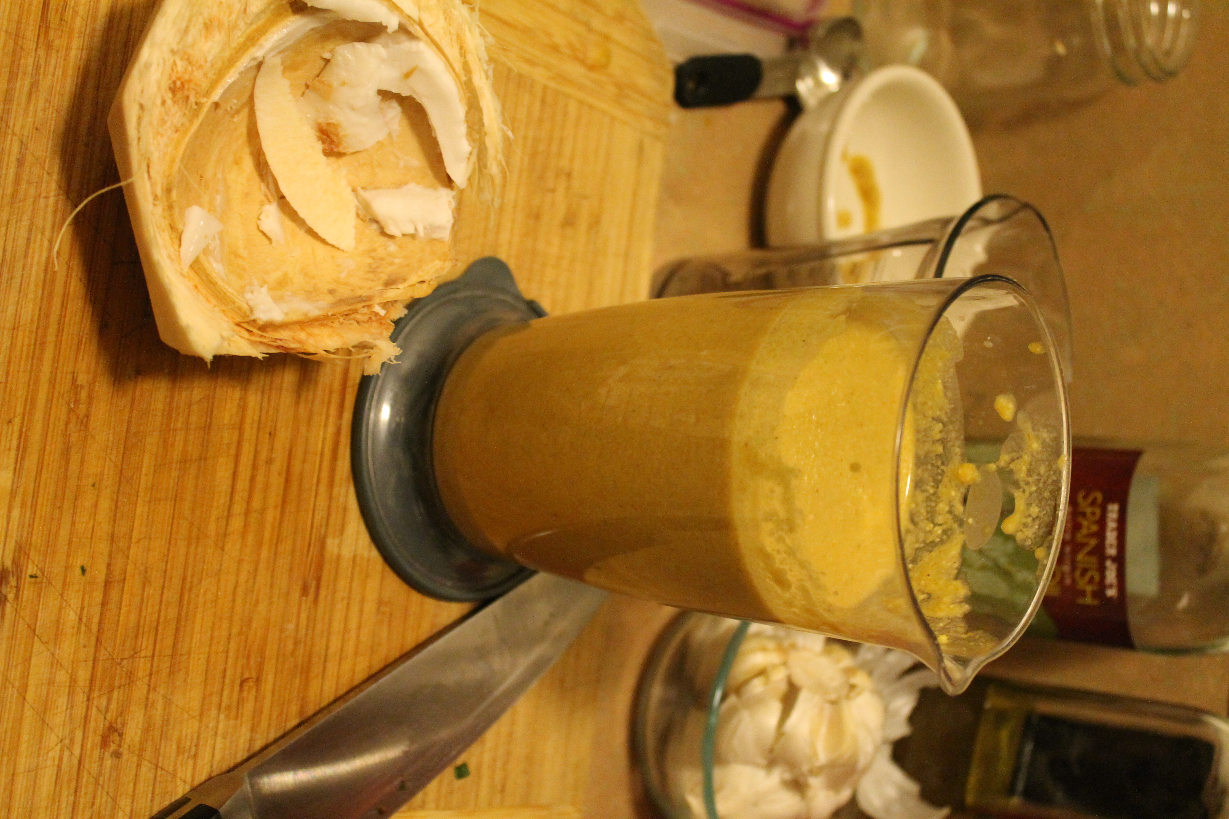 First, get a screwdriver, a hammer and an apron, as you’re going to have to force your way into this coconut. Try to cut some of the white, fibrous material from the outside first, and try not to let all of the coconut water go to waste once you get into the thing. Scrape out the coconut flesh from the inside and put into your blender (or container for your stick blender).