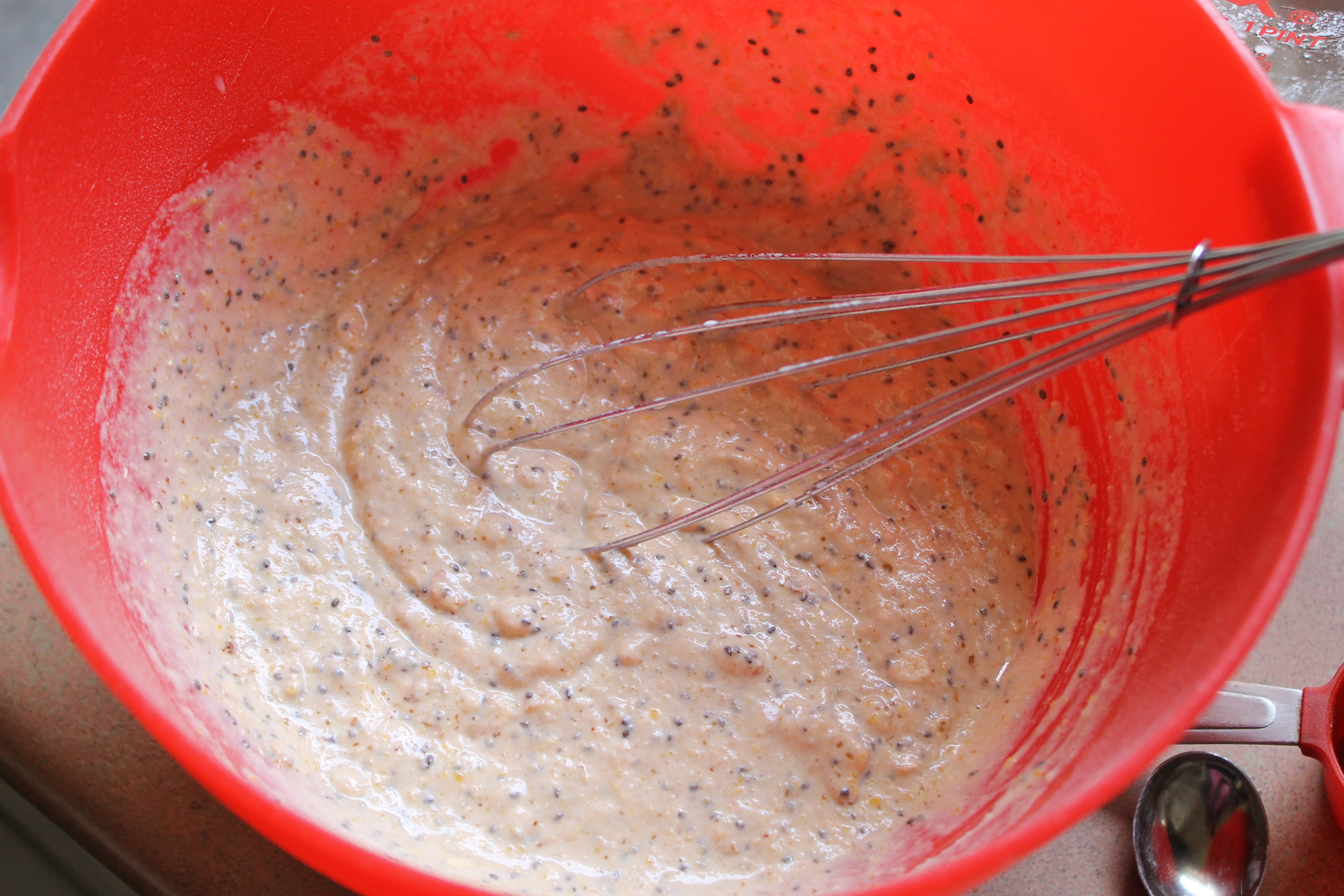 Add the liquid ingredients to the dry ingredients and stir until just thoroughly mixed. Try not to overwork. Add a little more coconut milk if the batter seems too thick, but be aware that this is a really thick batter.