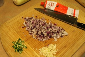 First combine all of the ingredients for the spice mix and set aside. Also, keep a cup of water within reach, you’ll need to add splashes as you cook.