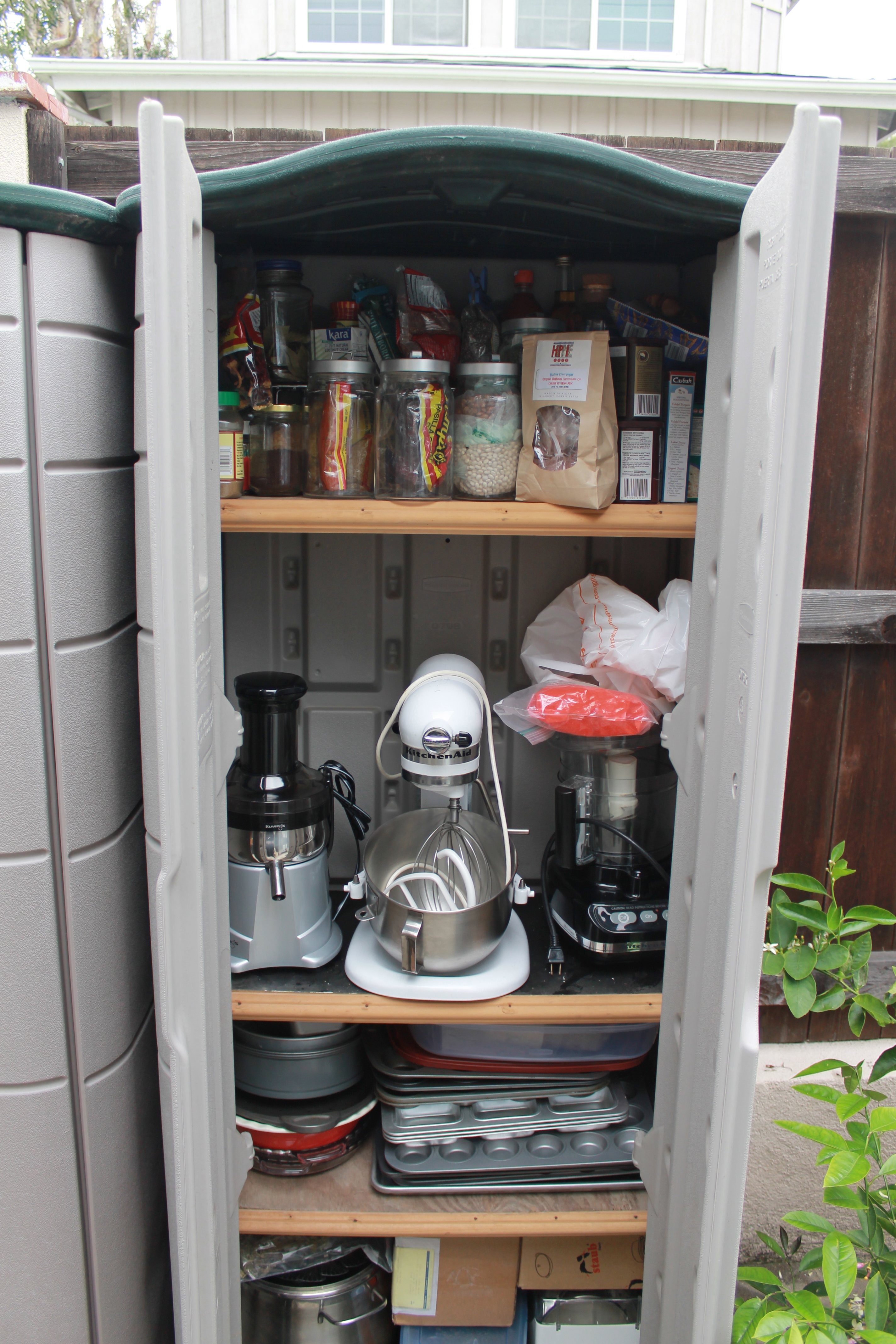 I’m trying not to get too excited, or too hung up on the idea because it might not happen. But I hope it does! And if we get those cabinets for cheap (from a house that is slated for demolition), there seems to be no reason not to, since ours are falling off the wall. Plus, see photo at right illustrating how little storage space we have. Dare I dream, dear readers?