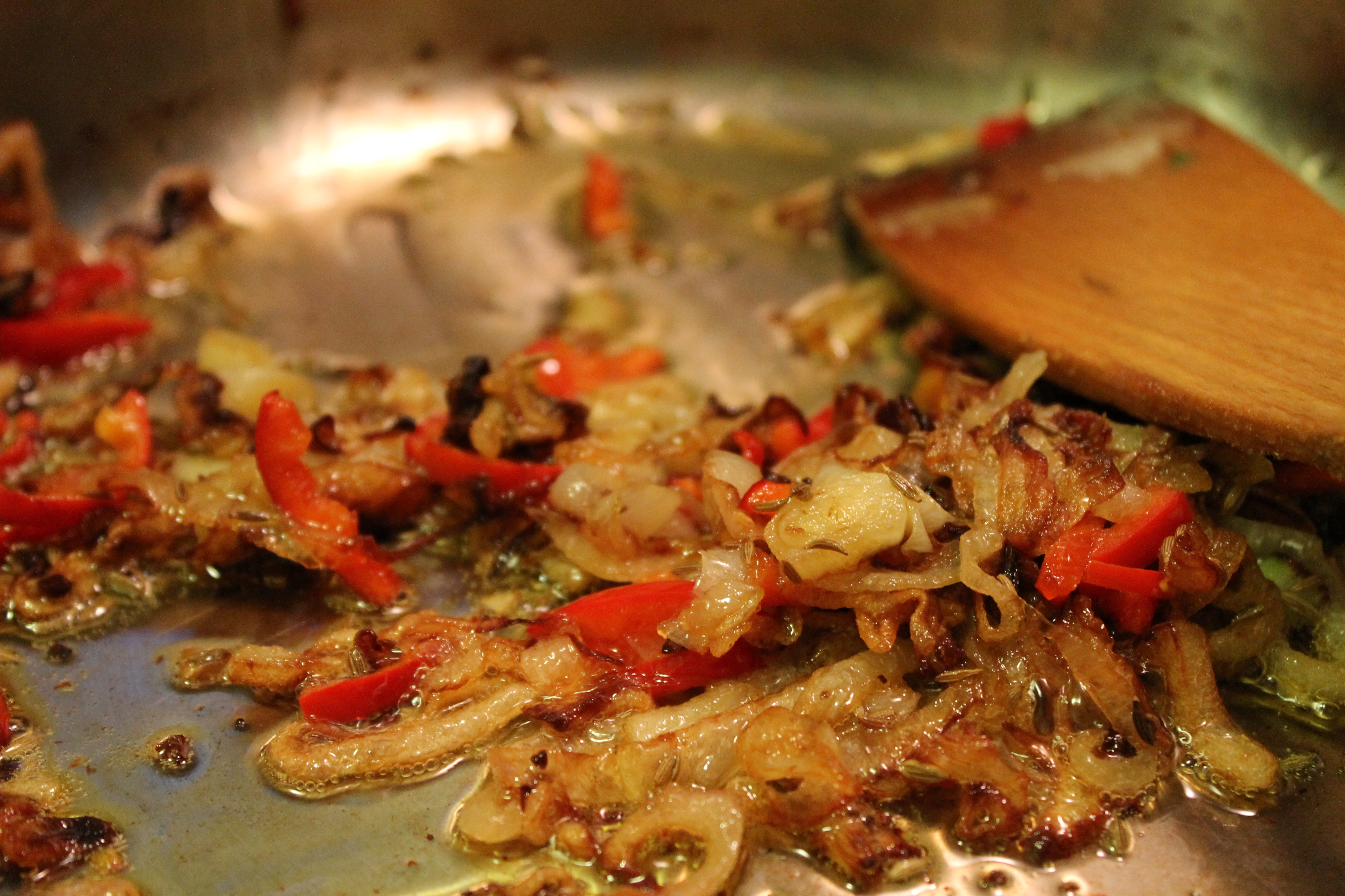 When the lentils are cooked, add the cilantro; set aside. In a large, heavy-bottomed frying pan. Sauté the shallots in coconut oil until deep golden brown, then add the chiles and cumin seeds; cook for another 3-5 minutes.
