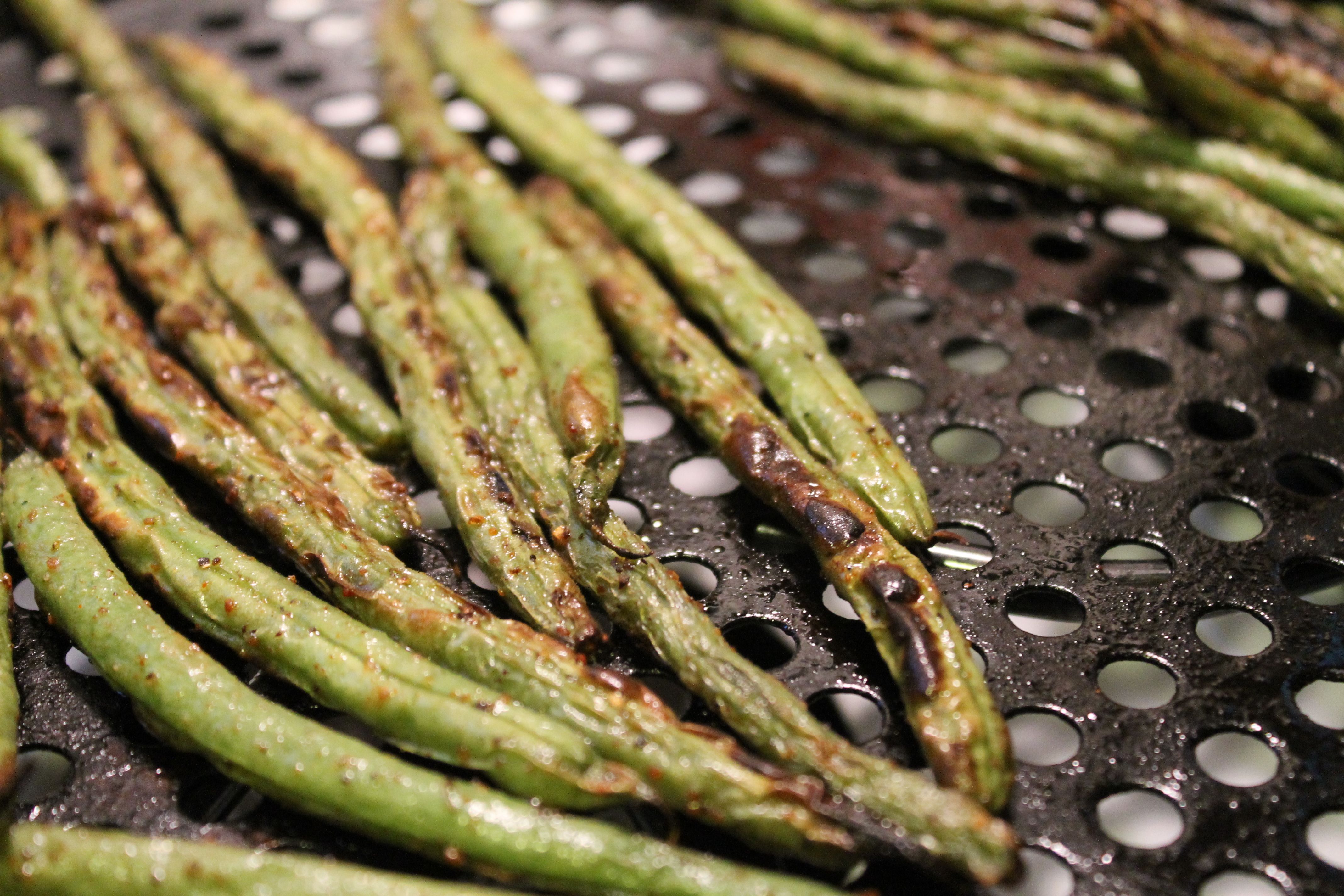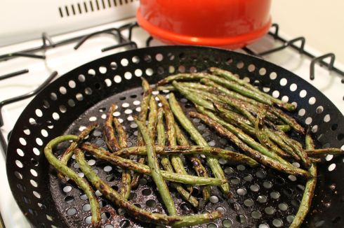 Using a vegetable grill pan or basket, cook the beans on the grill, watching carefully and cooking until they are still a little al dente, but have that nice char on them. Serve immediately! But try not to burn your fingers.