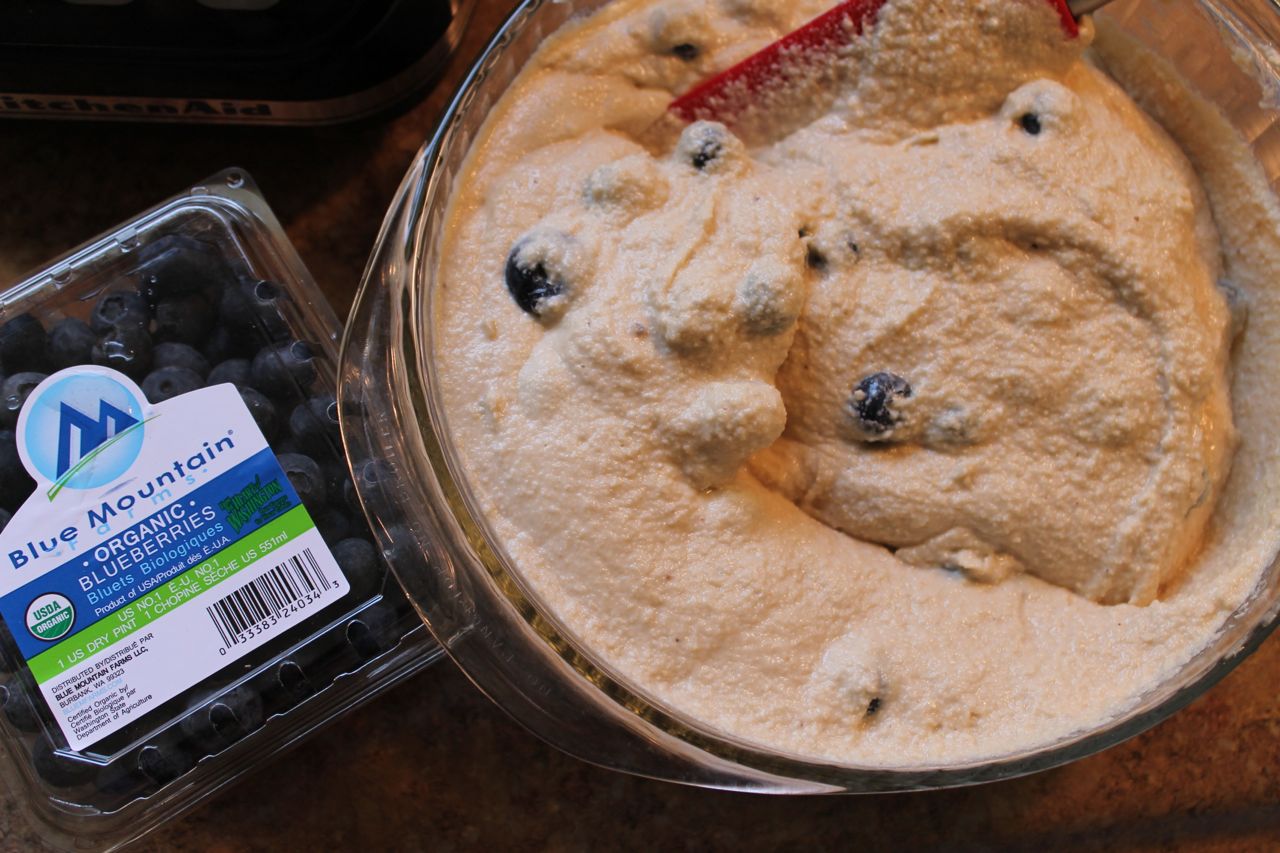 Mixing in the blueberries, under strict instructions not to make the cheesecake purple.