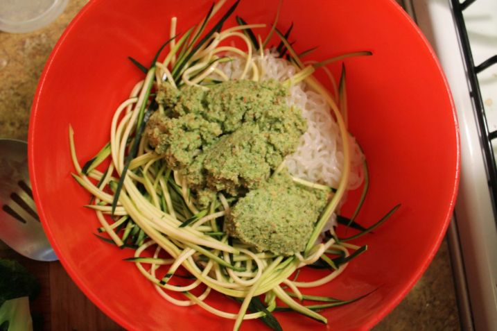 Then coat them in this broccoli pesto and you’ll be in vegan, almost raw heaven. And a little halo will light up over your head because you’re not eating processed noodles and you’re digging all this veggie goodness on your plate.