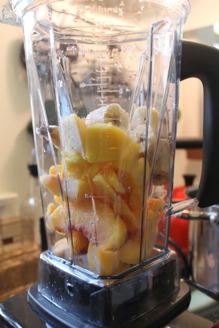 So here’s one that goes out to all my readers and fellow bloggers dealing with what will be 95°F-and-up weather tomorrow (and for Lauren who’s probably dealing with Carmageddon 2 on top of the heat). It’s vegan, it’s paleo, it’s sugar-free, it’s gluten-free and it’s downright delicious. I’m sure if you don’t have a Vitamix, you can defrost the fruit, blend everything together, then stick it in the freezer or an ice-cream maker.