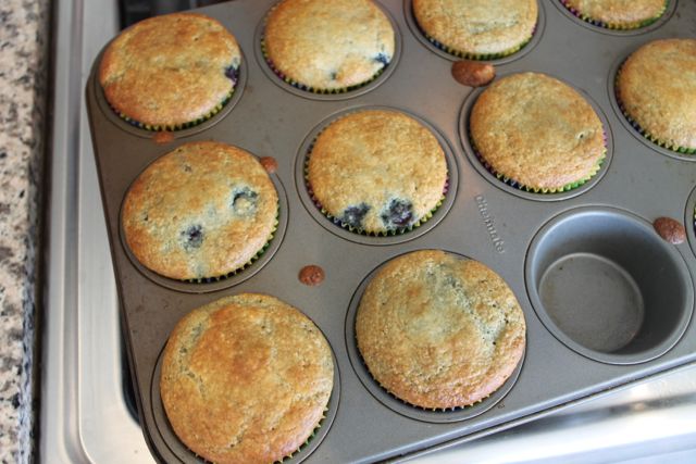 Combine the wet and dry ingredients, and stir just until mixed. Fold in the blueberries carefully, then evenly fill the muffin cups.