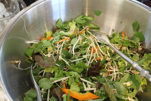 Take about a half-pound of large shallots and slice them carefully on the thinnest setting of a mandoline. Heat up coconut oil or another oil that’s good for high temperature cooking (PLEASE never never use canola oil!) and deep fry the shallots, in batches. Watch these carefully, as you think nothing’s happening for about 5-10 minutes, then BAM! They’re getting all brown and crispy in seconds flat. Scoop out with a slotted spoon or strainer spoon onto paper towels. Let cool and sprinkle over salad.