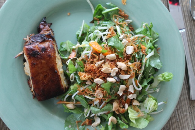Just before service, cut the cooked pork belly into portions, then place on a cookie sheet. Place under the broiler and watch carefully. You basically want to crisp up the fat on the top of the pork belly. Don’t let it burn! Serve immediately on top of the salad, topped with toasted, chopped cashew nuts and crispy shallots.