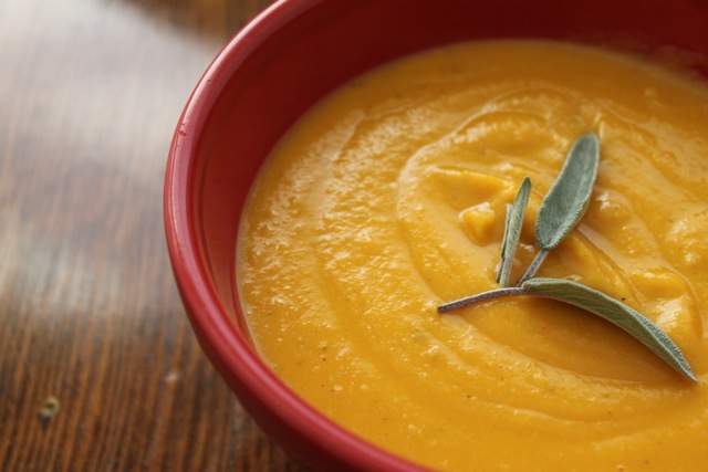 Add the roasted butternut squash, parsnips, carrots, apple, sage, chicken or vegetable broth and coconut milk to dutch oven or stock pot and bring to a boil, stirring often. Remove from heat and use an immersion blender to blend your soup or, working in several small batches, blend soup in a food processor or blender until smooth. Add more stock if it’s too thick for your liking.