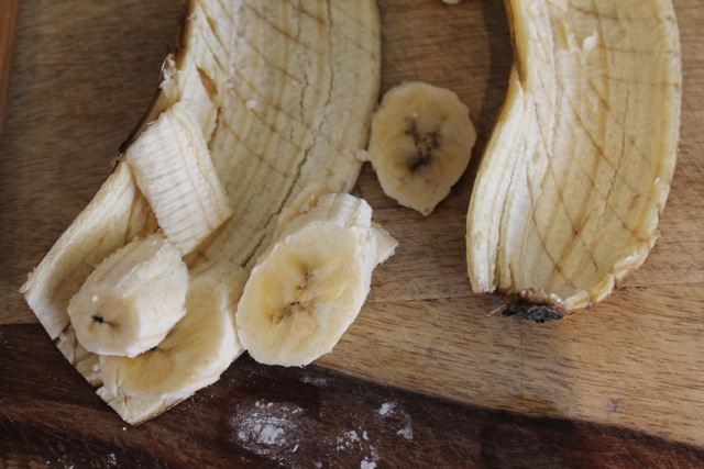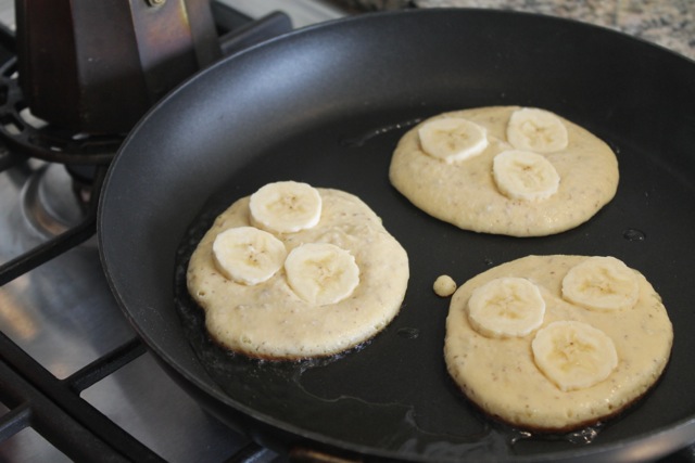 Banana paleo pancakes - 01Slice the bananas on the diagonal in 1/4-inch thick slices. Heat the bacon fat or other oil in a large skillet—I use Scanpans from Sur la Table, and I love them. Keep them handy as you ladle in the batter to the hot pan. Once you’ve poured out three pancakes, add at least three banana slices to each pancake. Cook these babies low and slow, as they won’t bubble up like normal pancakes. When the bottom is brown, flip carefully. (If you don’t they’ll look like this…)