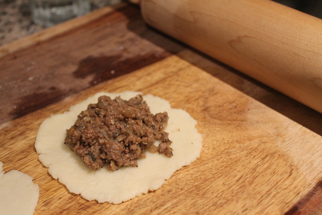 Preheat the oven to 400°F. Divide the dough into 10 equally-sized pieces. When the filling is cool and you’re ready to make the patties, divide each portion in half and roll into balls. Use a rolling pin to flatten each ball, place 2-3 tablespoons of filling on one piece and cover with the other piece. Fold the edges of the bottom piece over the top piece’s edges and seal well.
